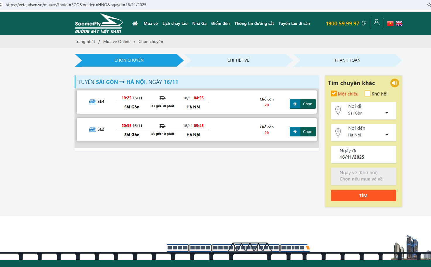 Hệ thống sẽ tự động liệt kê các chuyến tàu trong ngày chọn, có thể dễ dàng so sánh các chuyến tàu khác nhau về thời gian và giá vé. Chọn chuyến tàu phù hợp với lịch trình.